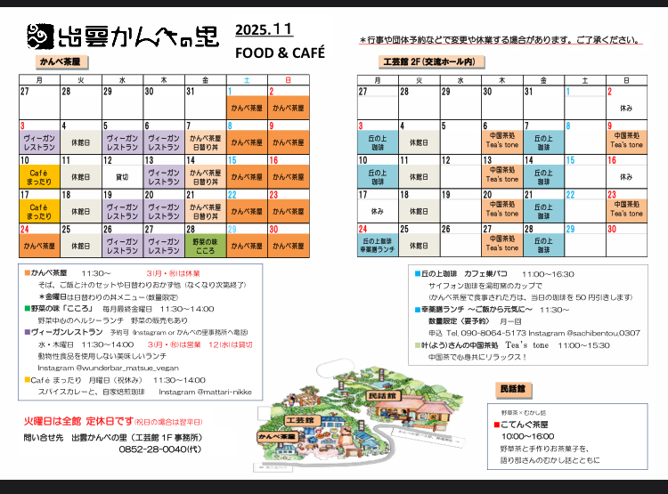 11月のかんべ茶屋レストランと、工芸館2階カフェの予定です