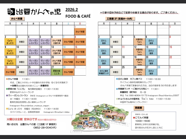 令和8年2月のかんべ茶屋レストランと、工芸館2階カフェの予定です